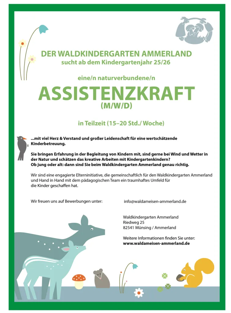 | 82541 Ammerland | Waldkindergarten Ammerland | Assistenzkraft (m/w/d) (15-20h) | 01.09.2025 | Weiter |