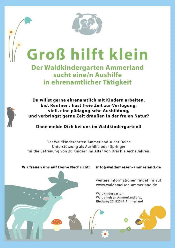 | 82541 Ammerland | Waldkindergarten Ammerland | Aushilfe (m/w/d) in ehrenamtlicher Tätigkeit | Weiter | |