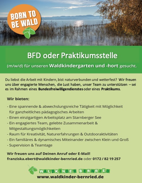 | 82347 Bernried am Starnberger See | Waldkinder Bernried | BFD oder Praktikumsstelle (m/w/d) | Weiter | |
