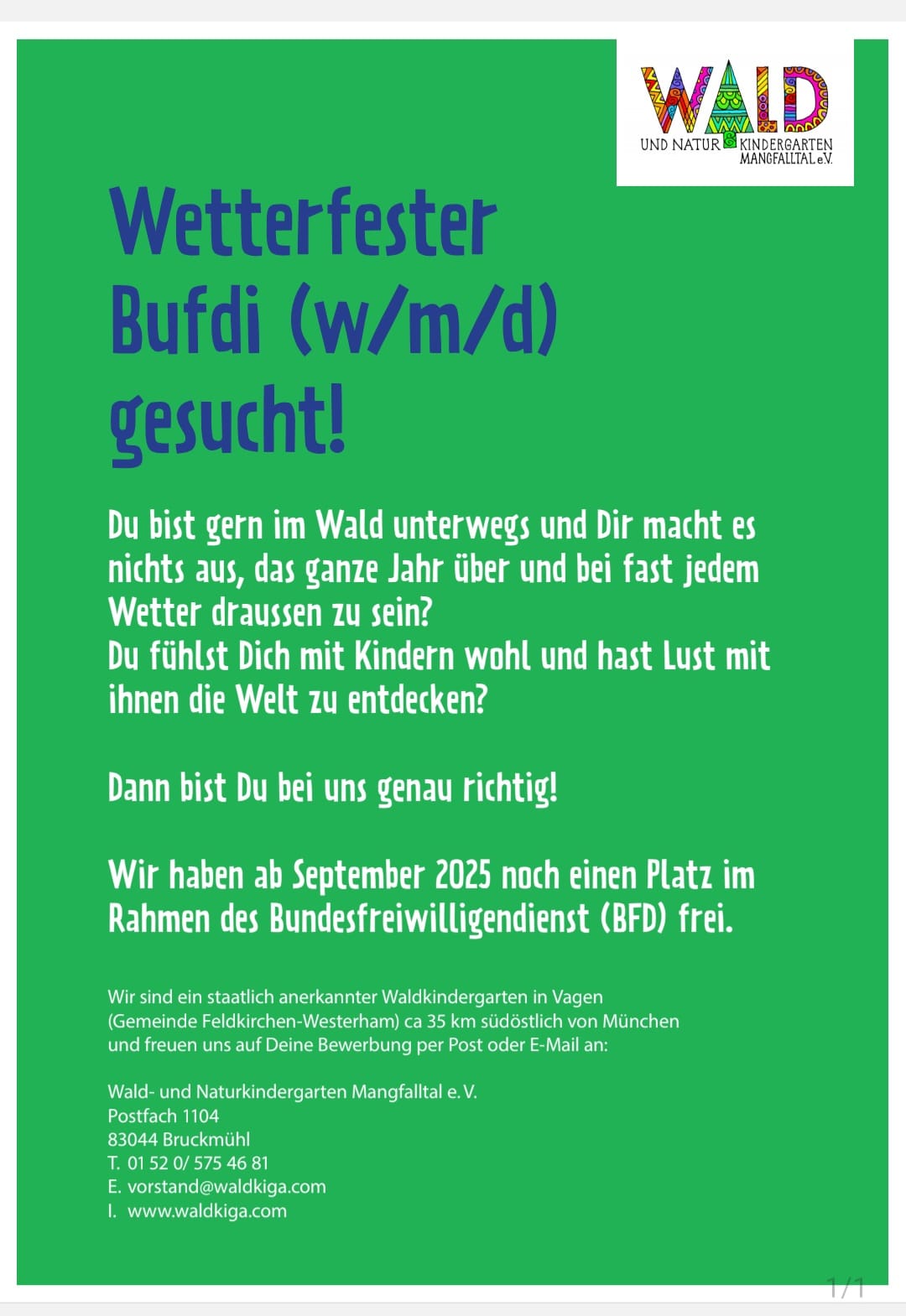 | 83044 Bruckmühl | Wald- und Naturkindergarten Mangfalltal e.V. | Wetterfester Bufdi (w/m/d) | 01.09.2025 | Weiter |