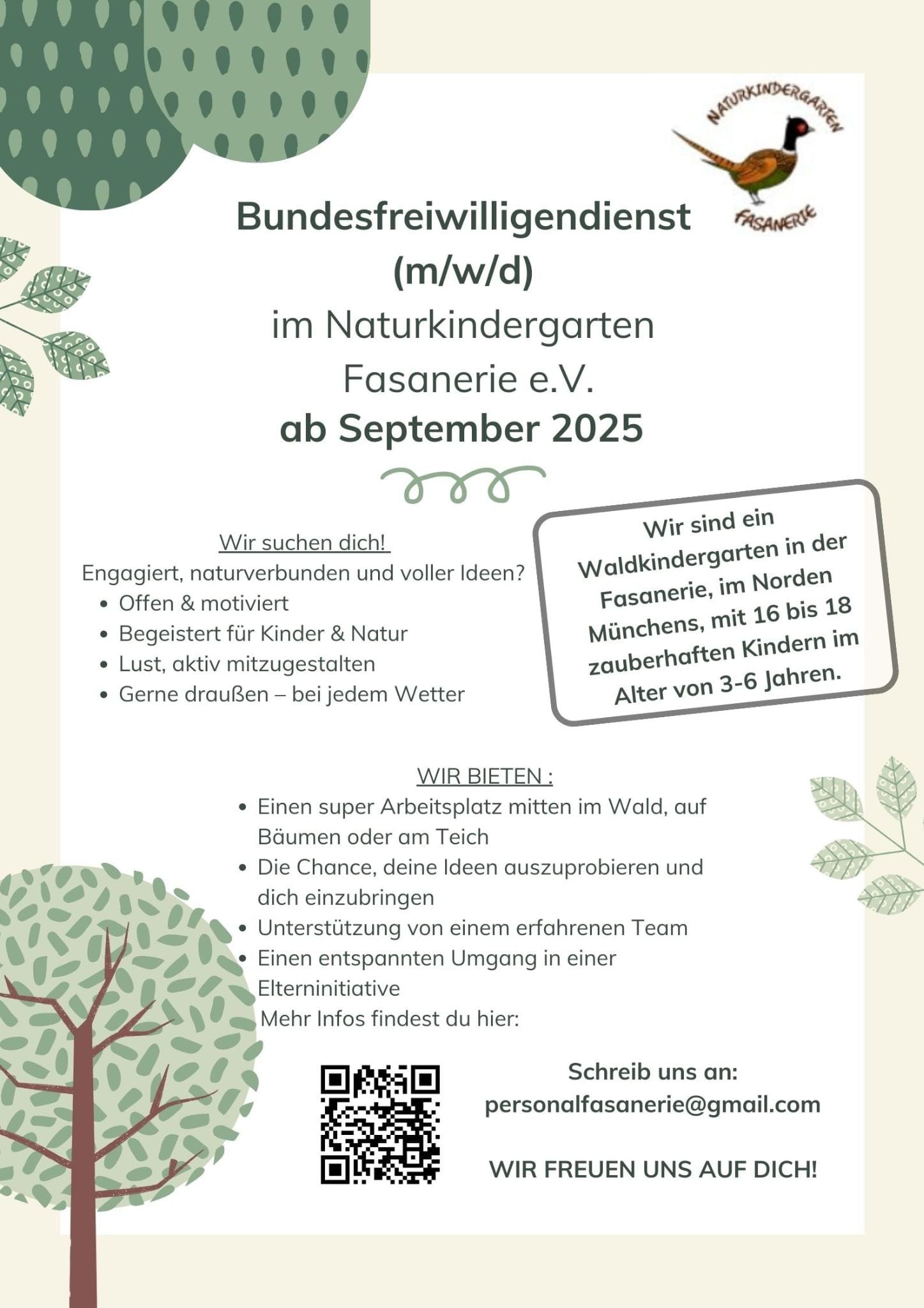 | 80995 München | Naturkindergarten Fasanerie | Bundesfreiwilligendienst (m/w/d) | 01.09.2025 | Weiter |