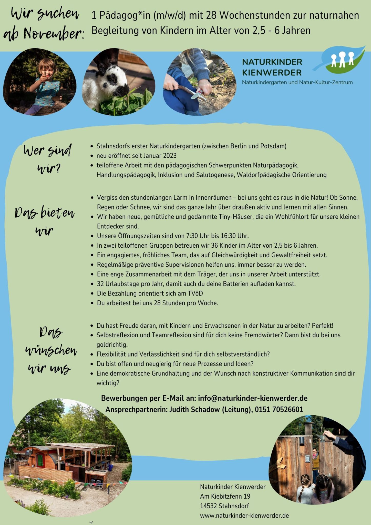 | 14532 Stahnsdorf | Naturkinder Kienwerder | Erzieher*In (m/w/d) für unseren Naturkindergarten zwischen Berlin und Potsdam (28 Wochenstunden) | Weiter | |