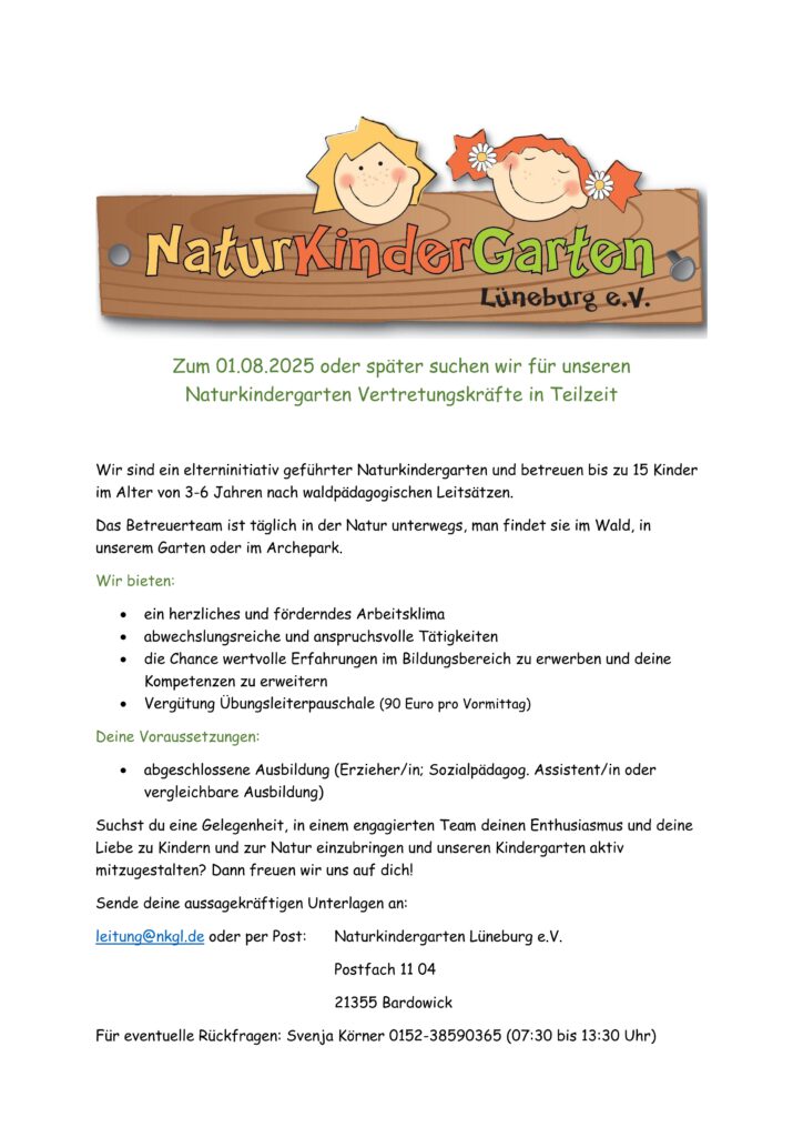 | 21339 Lüneburg | Naturkindergarten Lüneburg | Erzieher/in, Sozialpädagogischer Assistent/in oder vergleichbare Ausbildung (m/w/d) | 01.08.2025 | Weiter |