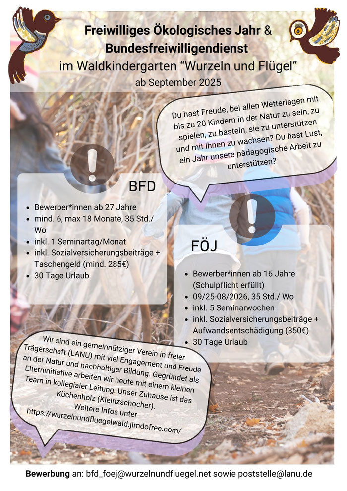 | 04229 Leipzig | Waldkindergarten Wurzeln und Flügel | FÖJ (m/w/d) | 01.09.2025 | Weiter |