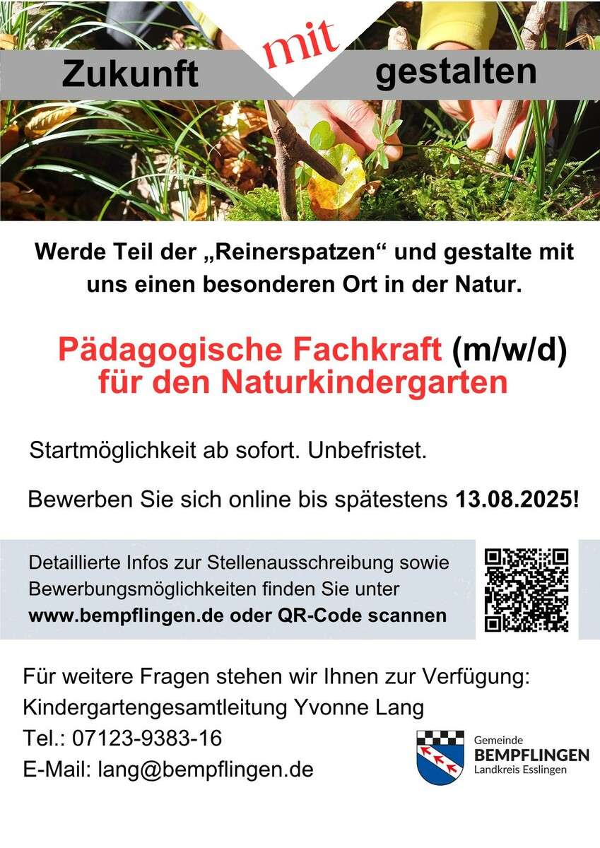 | 72658 Bempflingen | Naturkindergarten Reinerspatzen | Pädagogische Fachkraft (m/w/d) | inaktiv | Weiter |
