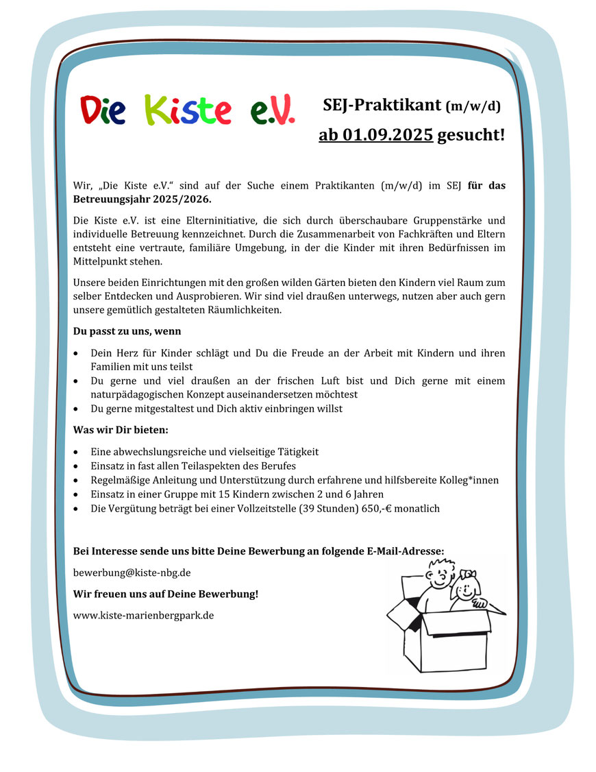 | 90425 Nürnberg | Die Kiste e. V. | SEJ Praktikant | Weiter | |
