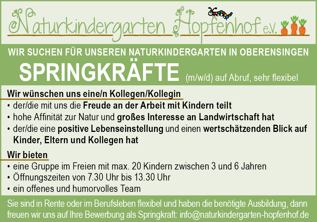 | 72622 Nürtingen | Naturkindergarten Hopfenhof | Springkräfte (m/w/d) auf Abruf, sehr flexibel | Weiter | |