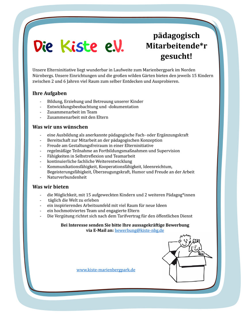 | 90425 Nürnberg | Die Kiste e. V. | Pädagogische Mitarbeitende*r | Weiter | |